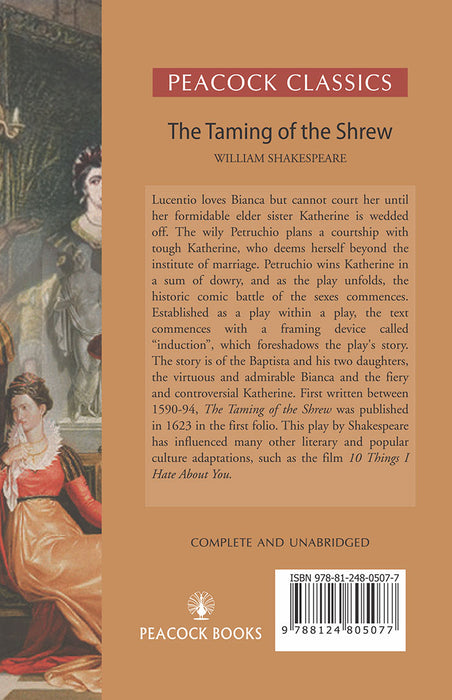 Lucentio loves Bianca but cannot court her until her formidable elder sister Katherine is wedded off. The wily Petruchio plans a courtship with tough Katherine, who deems herself beyond the institute of marriage. Petruchio wins Katherine in a sum of dowry, and as the play unfolds, the historic comic battle of the sexes commences. Established as a play within a play, the text commences with a framing device called “induction”, which foreshadows the play's story. The story is of the Baptista and his two daughters, the virtuous and admirable Bianca and the fiery and controversial Katherine. First written between 1590-94, The Taming of the Shrew was published in 1623 in the first folio. This play by Shakespeare has influenced many other literary and popular culture adaptations, such as the film 10 Things I Hate About You.