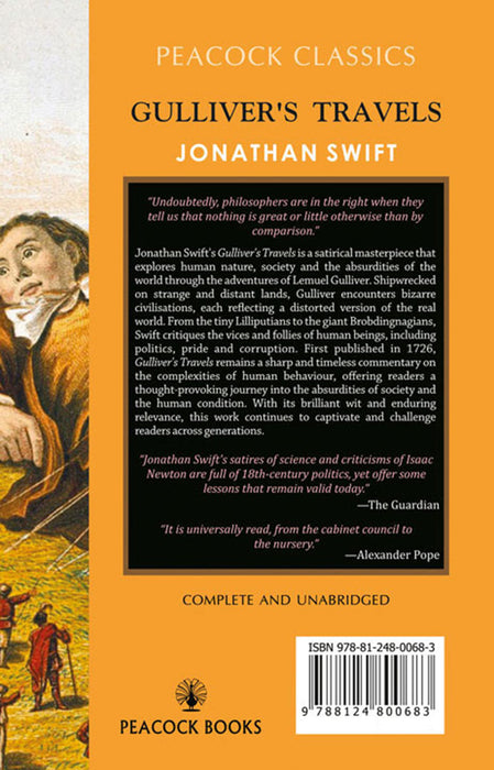 Jonathan Swift's Gulliver's Travels is a satirical masterpiece that explores human nature, society and the absurdities of the world through the adventures of Lemuel Gulliver. Shipwrecked on strange and distant lands, Gulliver encounters bizarre civilisations, each reflecting a distorted version of the real world. From the tiny Lilliputians to the giant Brobdingnagians, Swift critiques the vices and follies of human beings, including politics, pride and corruption. First published in 1726, Gulliver's Travels remains a sharp and timeless commentary on the complexities of human behaviour, offering readers a thought-provoking journey into the absurdities of society and the human condition. With its brilliant wit and enduring relevance, this work continues to captivate and challenge readers across generations.